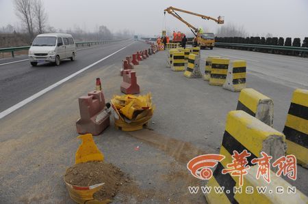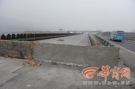 昨日上午,記者乘車從藍田東收費站進入滬陜高速前往西安方向,沒走多遠就看到一溜塑料隔離墩引導著車輛向右行駛。隔離區域內,十余名工人正在吊裝安放水泥隔離墩,而高速路的正前方,則是用磚塊砌起來一堵墻,橫跨整個路面,整個墻上沒有任何交通標識。鄒鐵琴指著已經被抹上一層水泥的墻體說:“這就是我們那天撞上去的,這是剛剛補上的!庇浾吣繙y了一下,墻的高度在1.2米左右。一現場指揮的工作人員稱,被墻堵住的路是西商二線,由于工程沒有完工,所以將道路堵住。